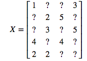 The task of collaborative filtering, then, is to “fill in” the remaining entries of this matrix given the observed matrix. This X matrix that we observed is sparse but the unknown entries do not correspond to actual zeros in the matrix, but are rather just truly unknown.